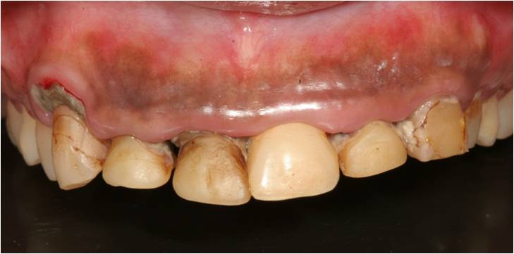 ブリッジを除去し感染した歯を抜歯した後の状態です。 歯槽骨は水平的、垂直的に大きく欠損してしまい正常な形の歯を入れることができません。またこの状況が談笑時に見えてしまいます。 |