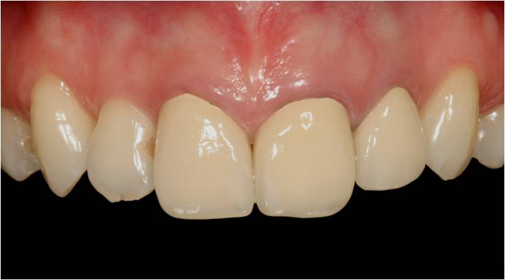 一番前の歯のかぶせの長さが短いため、歯周形成外科手術(歯冠長延長術)により長さを揃え、オールセラミッククラウンで修復。